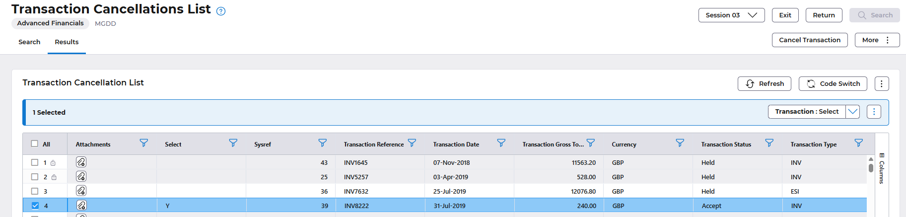 Select the transaction you wish to cancel followed by the Transaction: Select button.