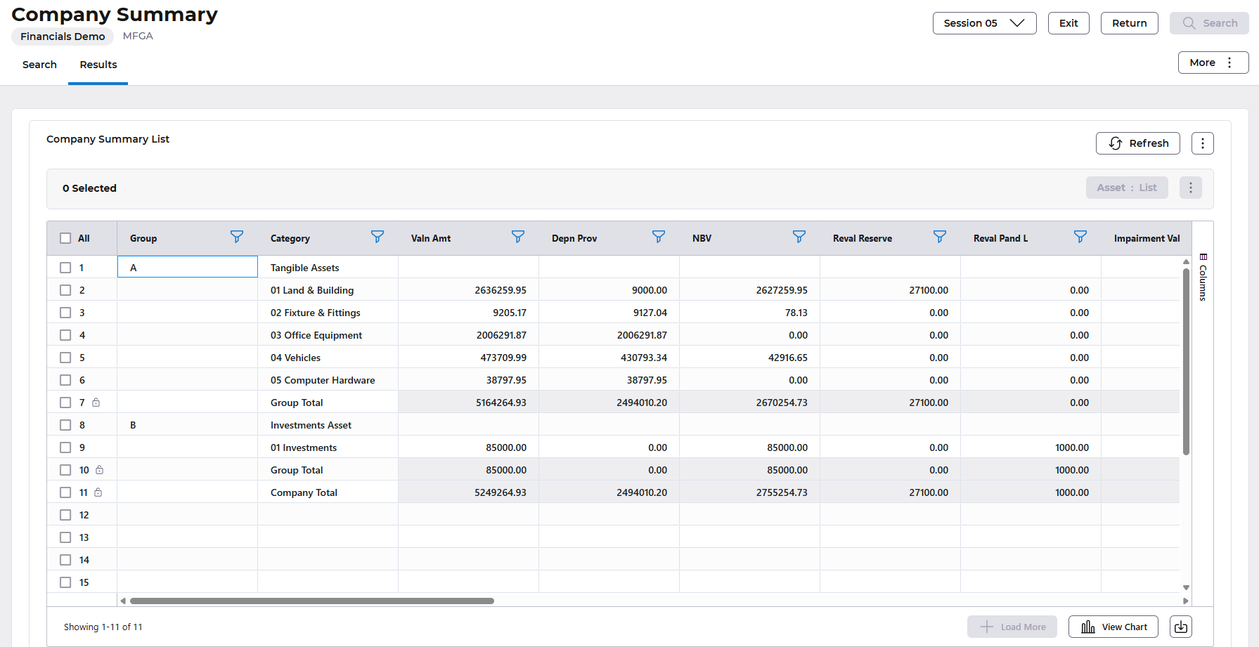 Use this enquiry to view a summary of all the assets within your company. The display is similar to that for balance sheets in General Ledger, breaking down the totals by Asset Group and Category within the company.