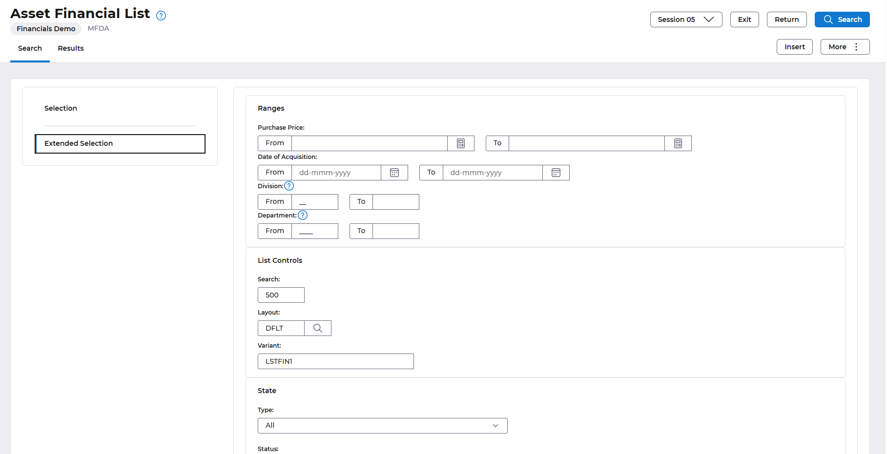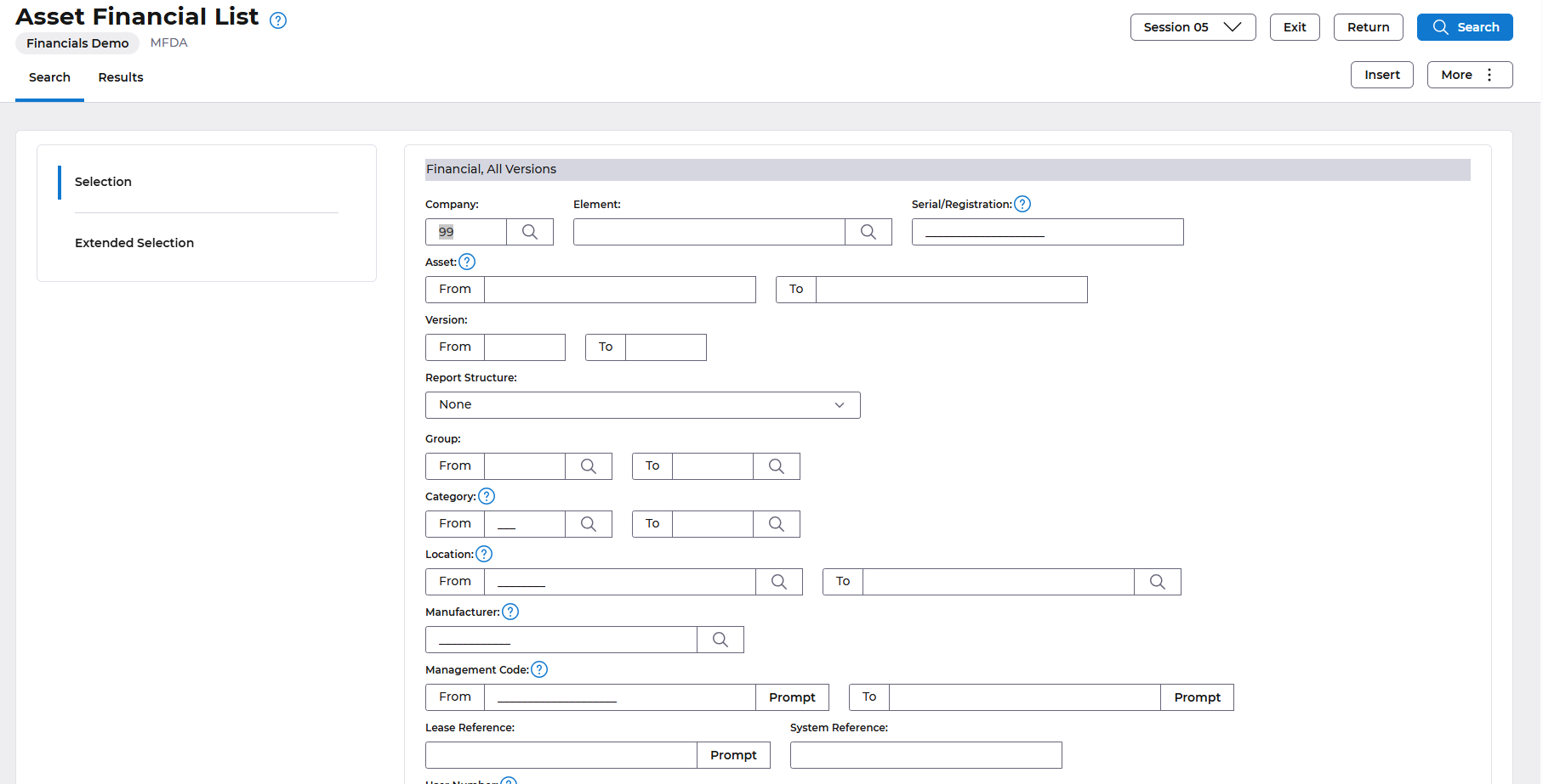 Selecting the Search button the selection screen will display all assets or, by entering other values into the selections, you can filter your enquiry to the detail required.