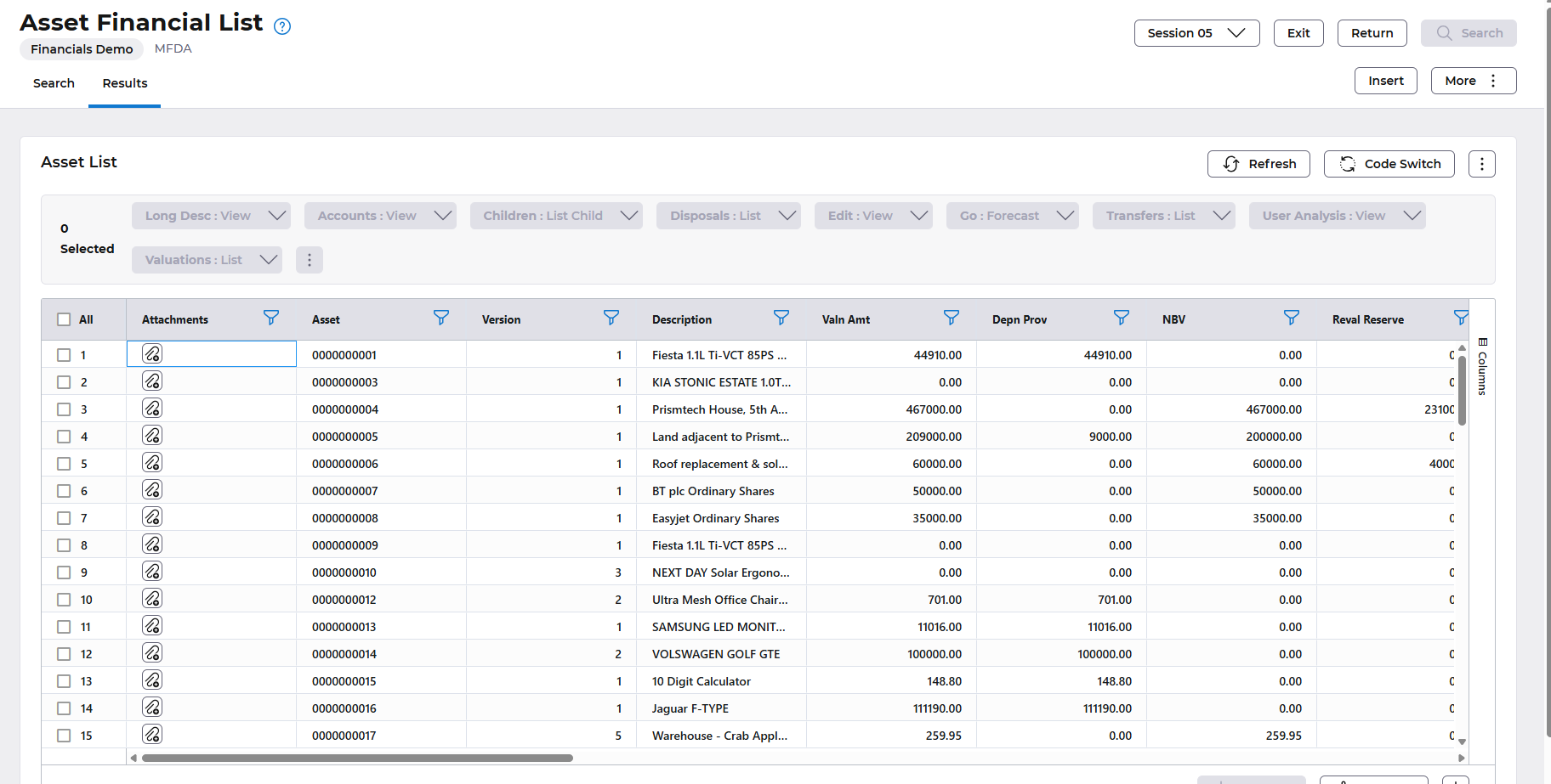 You can use this screen to view summary information for all the assets within your company. The display can be configured to show either basic asset information or financial asset information.