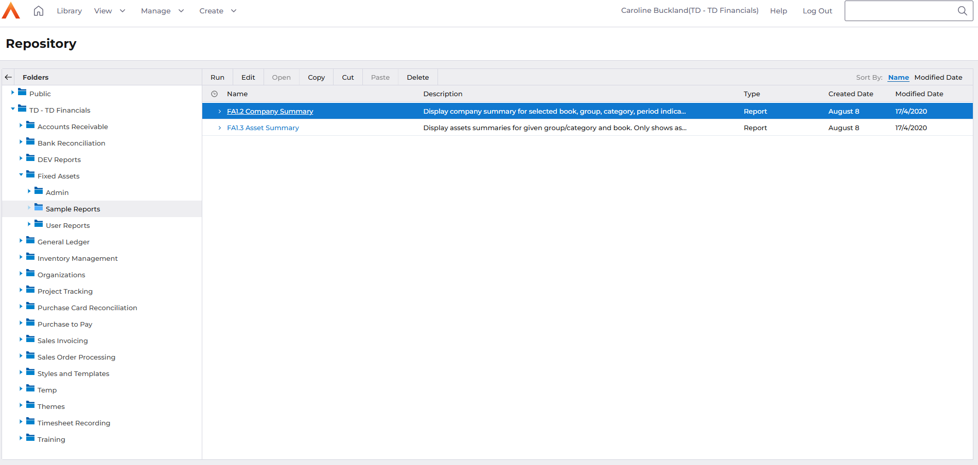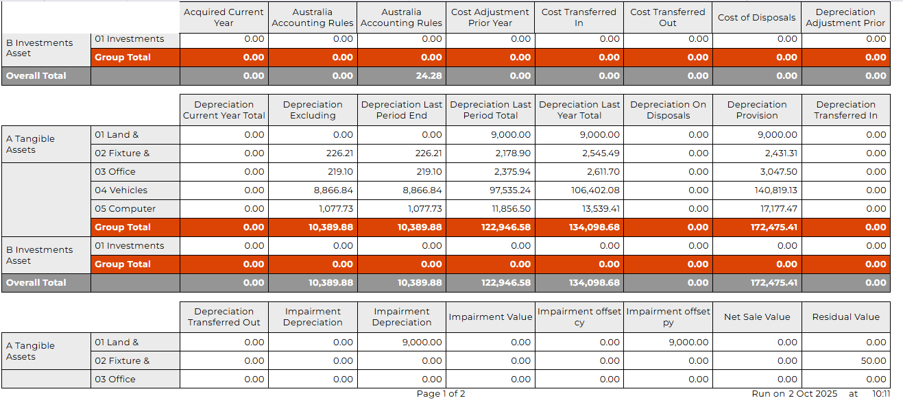 - Transaction Audit Report - gives a break down by fixed assets group and category by valuations, depreciation, transfers, revaluations etc