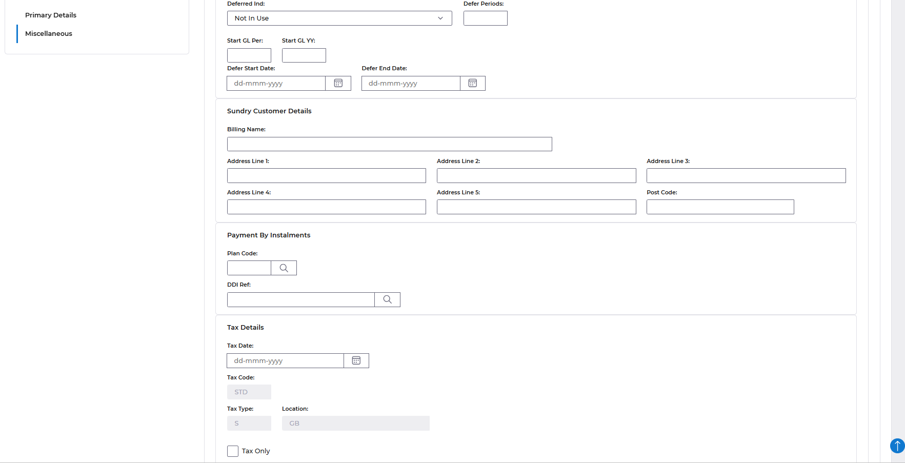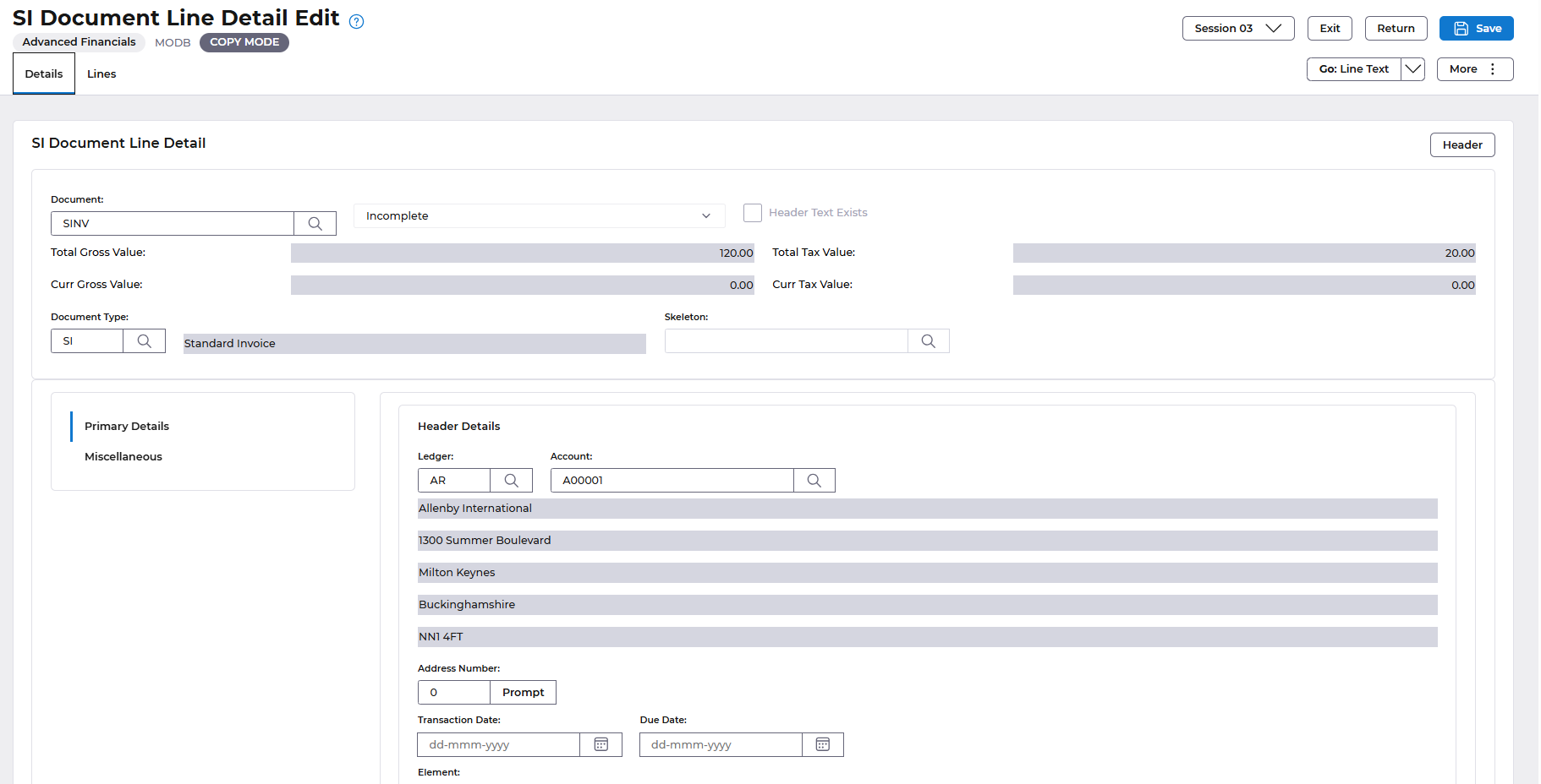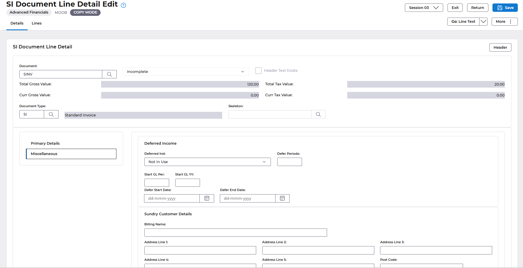 Enter the header and line details as described above then select the Miscellaneous tab and the Sundry Customer Address fields are displayed.