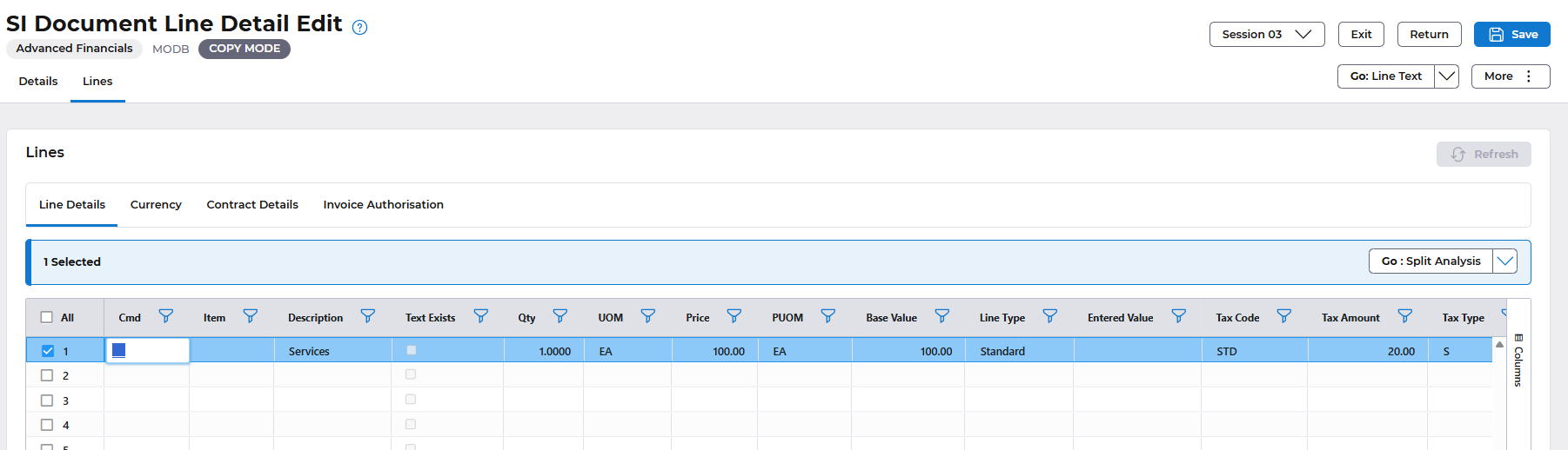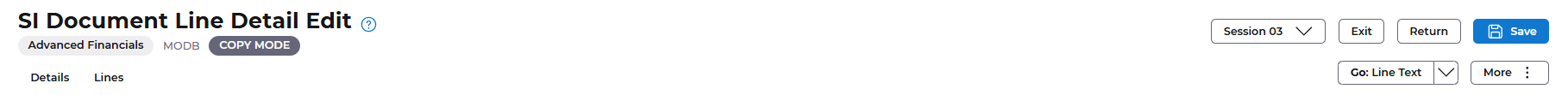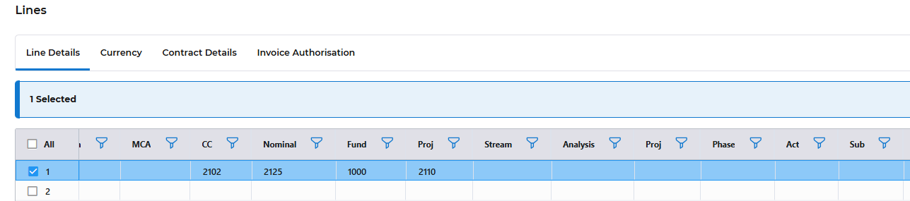 Select the Save button. This will validate the codes you enter and take you to the Lines format.