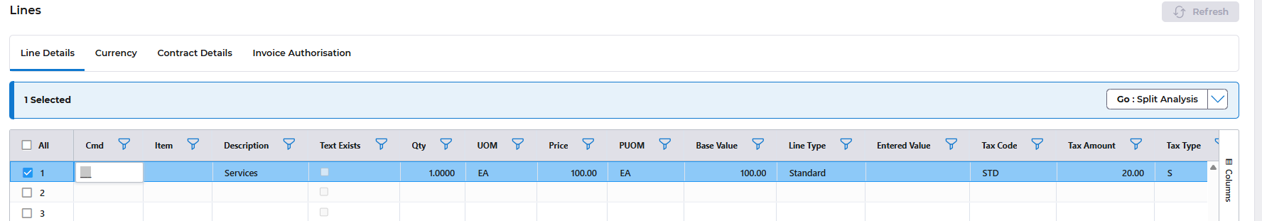 Price: enter the charge value, note if you enter Qty and Price the line Nett Value will be calculated in Base Value