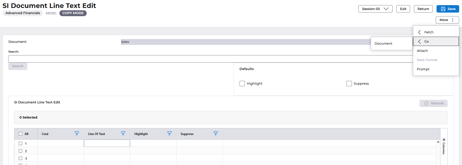 - At the selection window Document field enter the invoice number you want to copy.