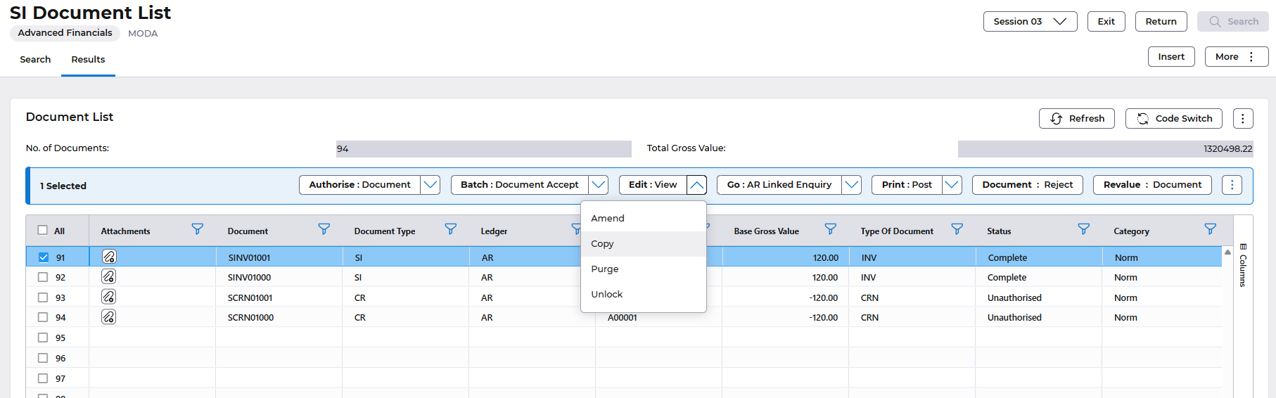 - Select List Invoices/Credit Notes from the AR Data Entry menu