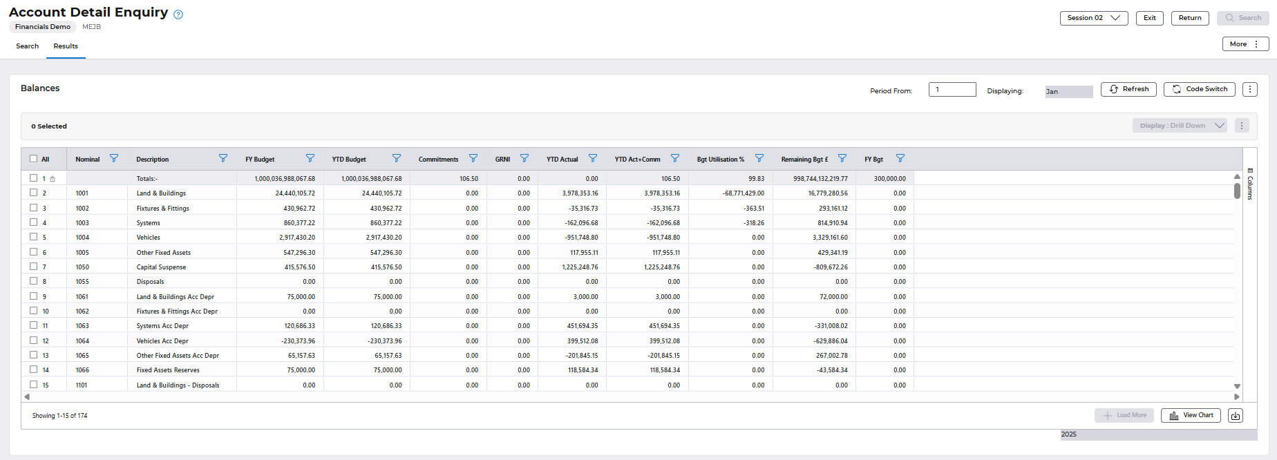 The Balances screen displays a list of nominal balances depending on the criteria you select.
