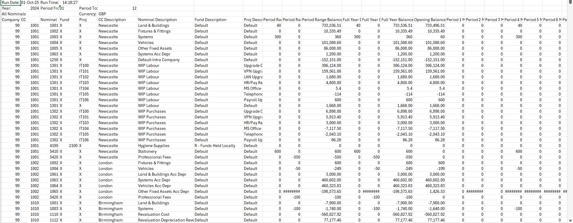 This report is found in General Ledger > Sample Reports > Ad Hoc views and Reports and lists all Nominal Codes with the opening balances, closing balances and movements. There are several filters you can change to focus the report output as required.
