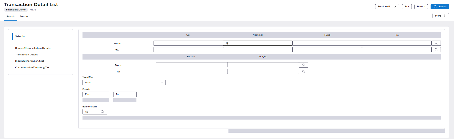 To get full details for all of your Nominal accounts enter % in the Nominal selection field. Selecting Search will give you a list of all transactions for the current period. Enter values into the other selection will enable you to filter to specific elements as required.