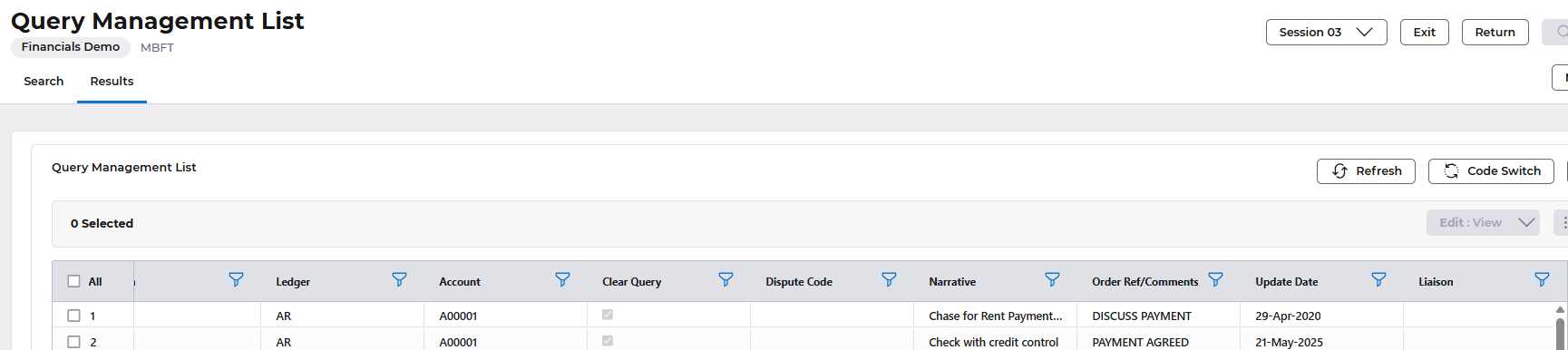Access the Credit Control List menu and then select Maintain Query and Dispute Codes. This will display a Selection Window where parameters may be entered for enquiry purposes or the appropriate ‘Insert’ command selected.