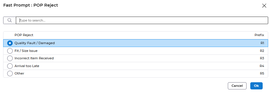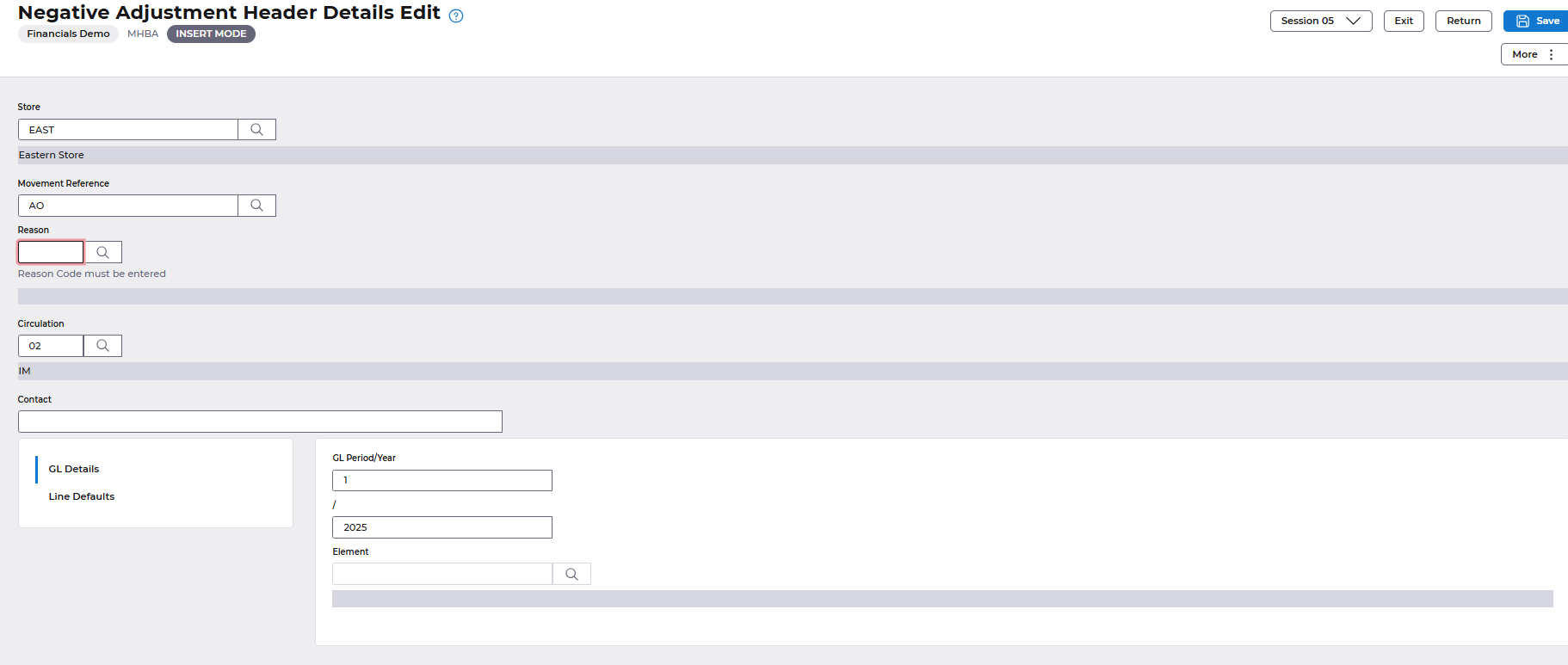 Select the Save action, and this will default entries into the Movement Reference and Element fields, and you will prompt to enter a Reason Code to explain why the stock is being adjusted, you can click on the Search icon next to the Reason Code field to see available reasons.