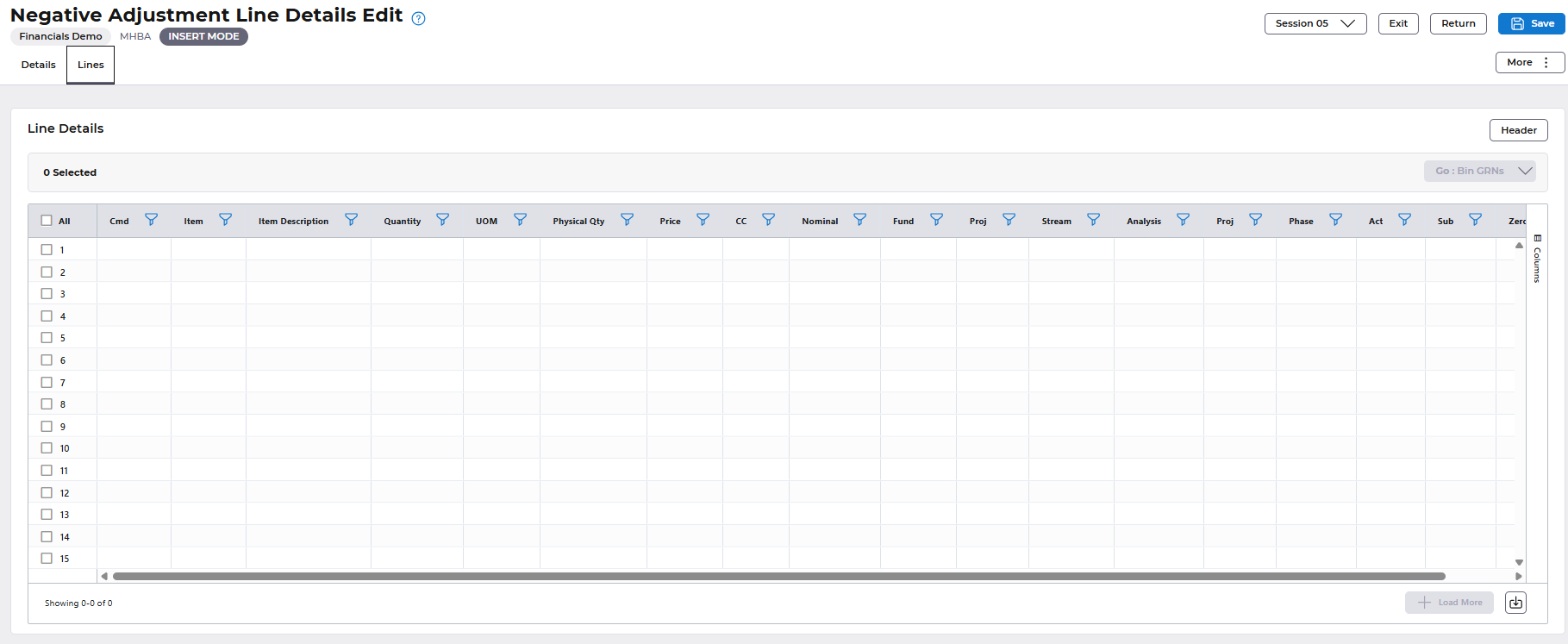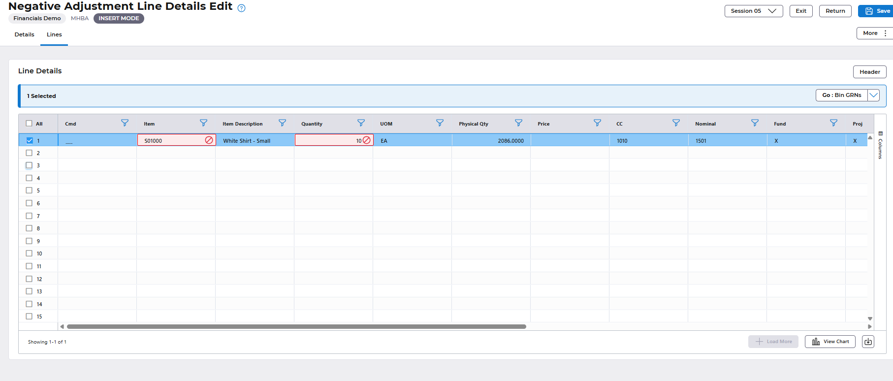 Select the Reason and select OK button to return to the Stock Adjustment header, select the Save button again and this will remove the previous message and leave the error that at least one line must be entered.