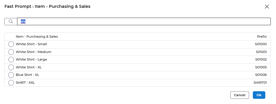 Enter the Item and the Quantity being adjusted, you can use the Search icon and start typing the Item Code or the Item name to find the Item.