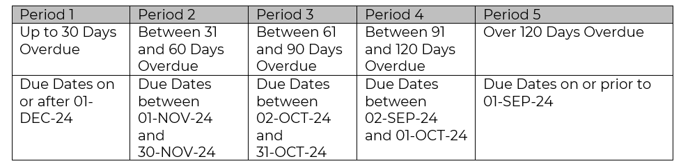 Retrospective date is 31-Dec-24 with period lengths of 30 days but from an ‘overdue’ perspective, then the 5 period ranges for the report are calculated as below: