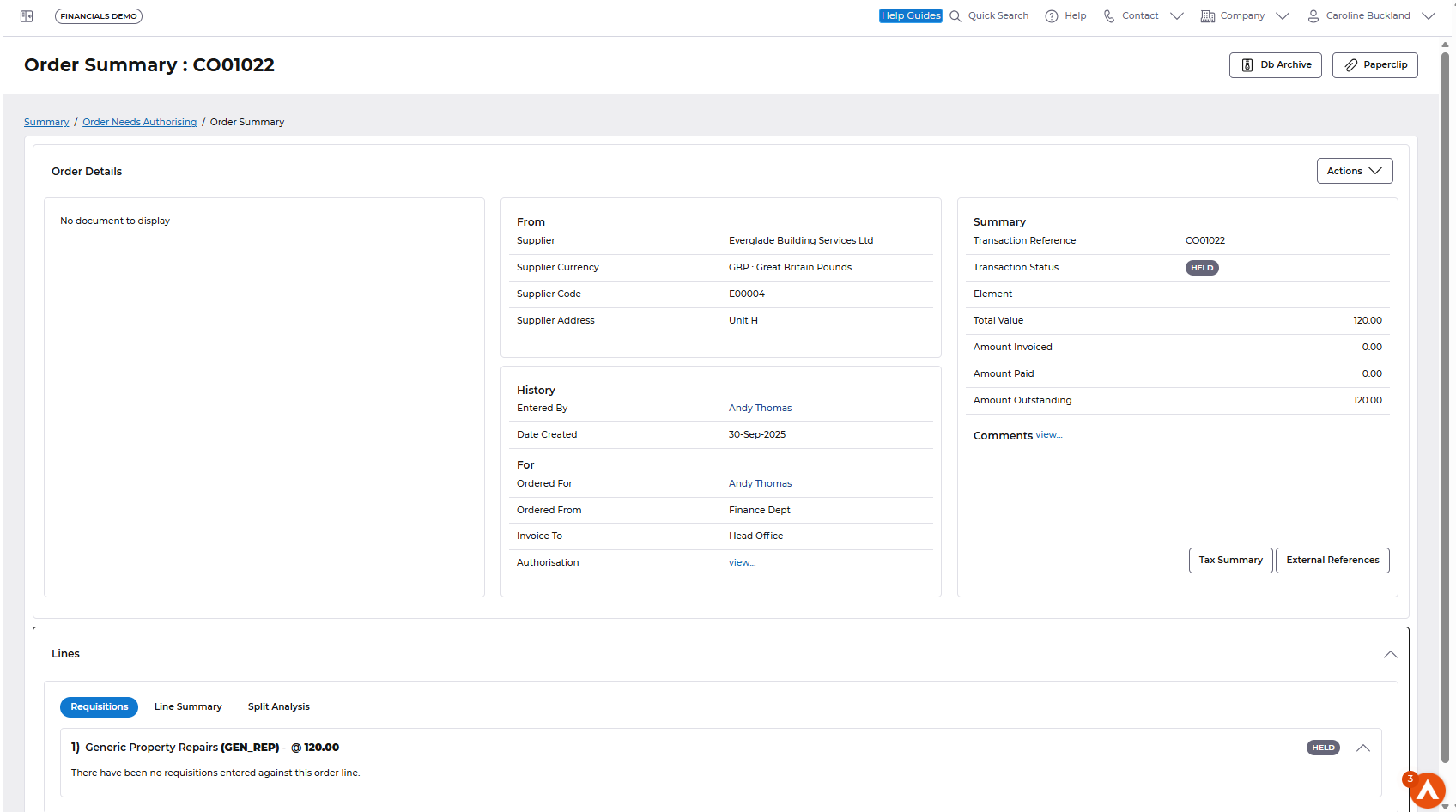 The top part of the screen will show the order summary, supplier, values and creator details.