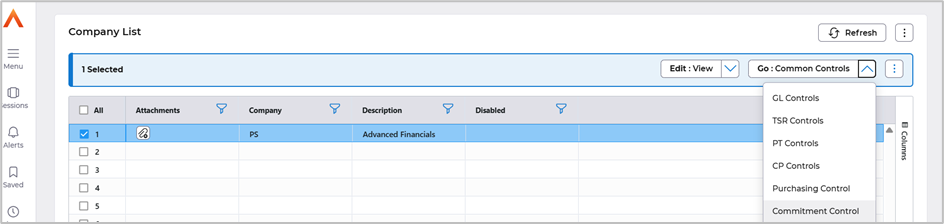 System Admin>Combined Company Controls, locate the company and use the Go>Commitment Control option.