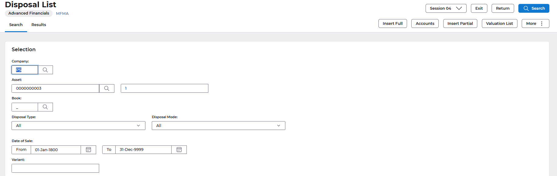 Enter the Asset number in the Selection Window or enter another criteria. Select Search.