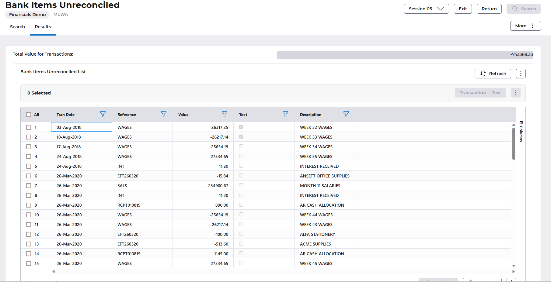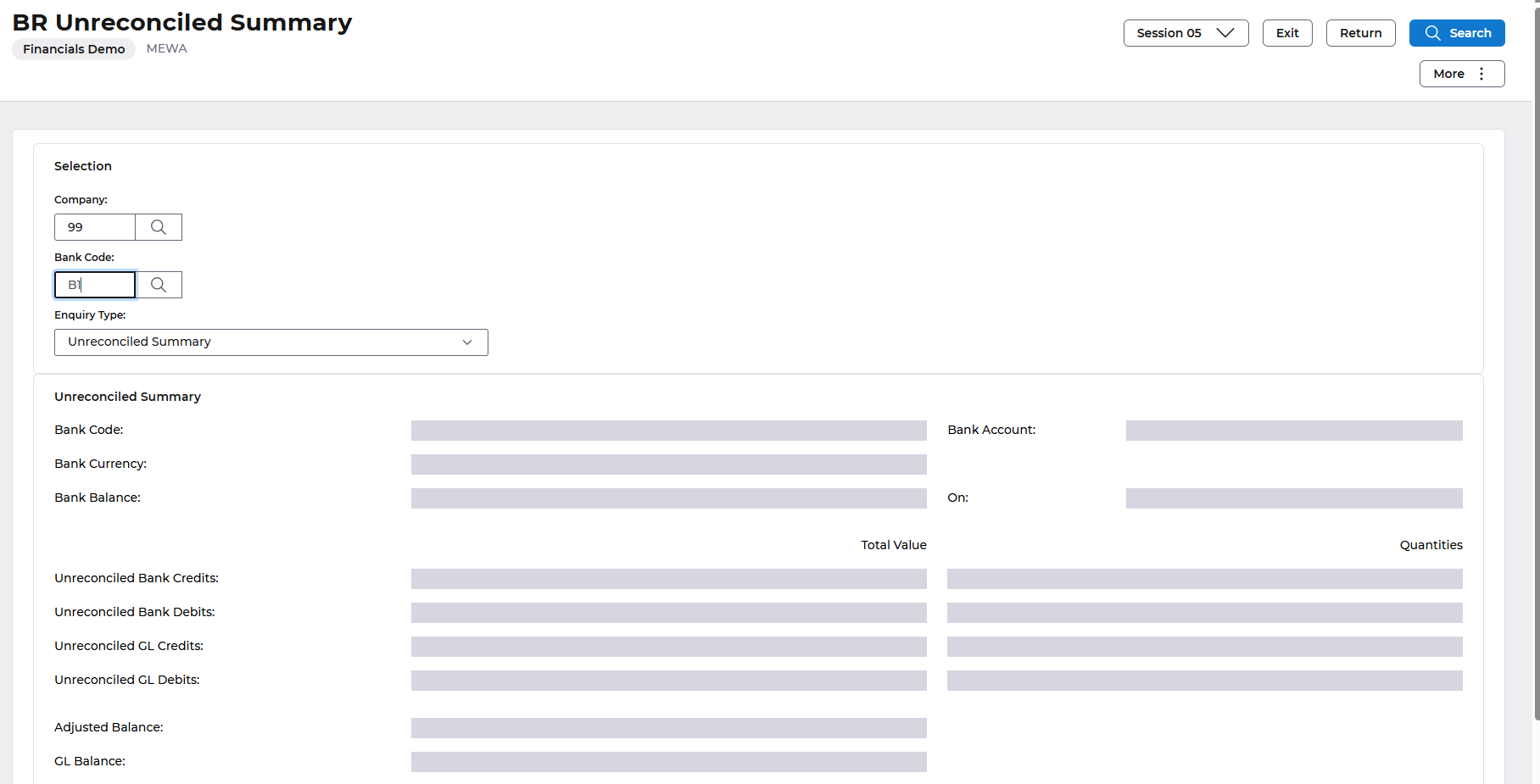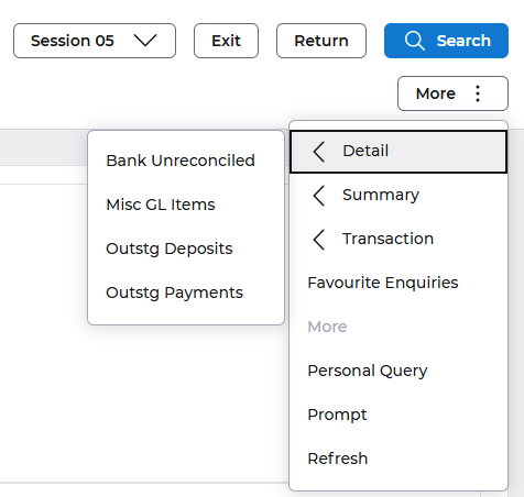 Use the More button to display to other unreconciled transactions for relative to Miscellaneous GL Items, Unpresented Payments, Deposits not Banked or Bank Items Unreconciled.