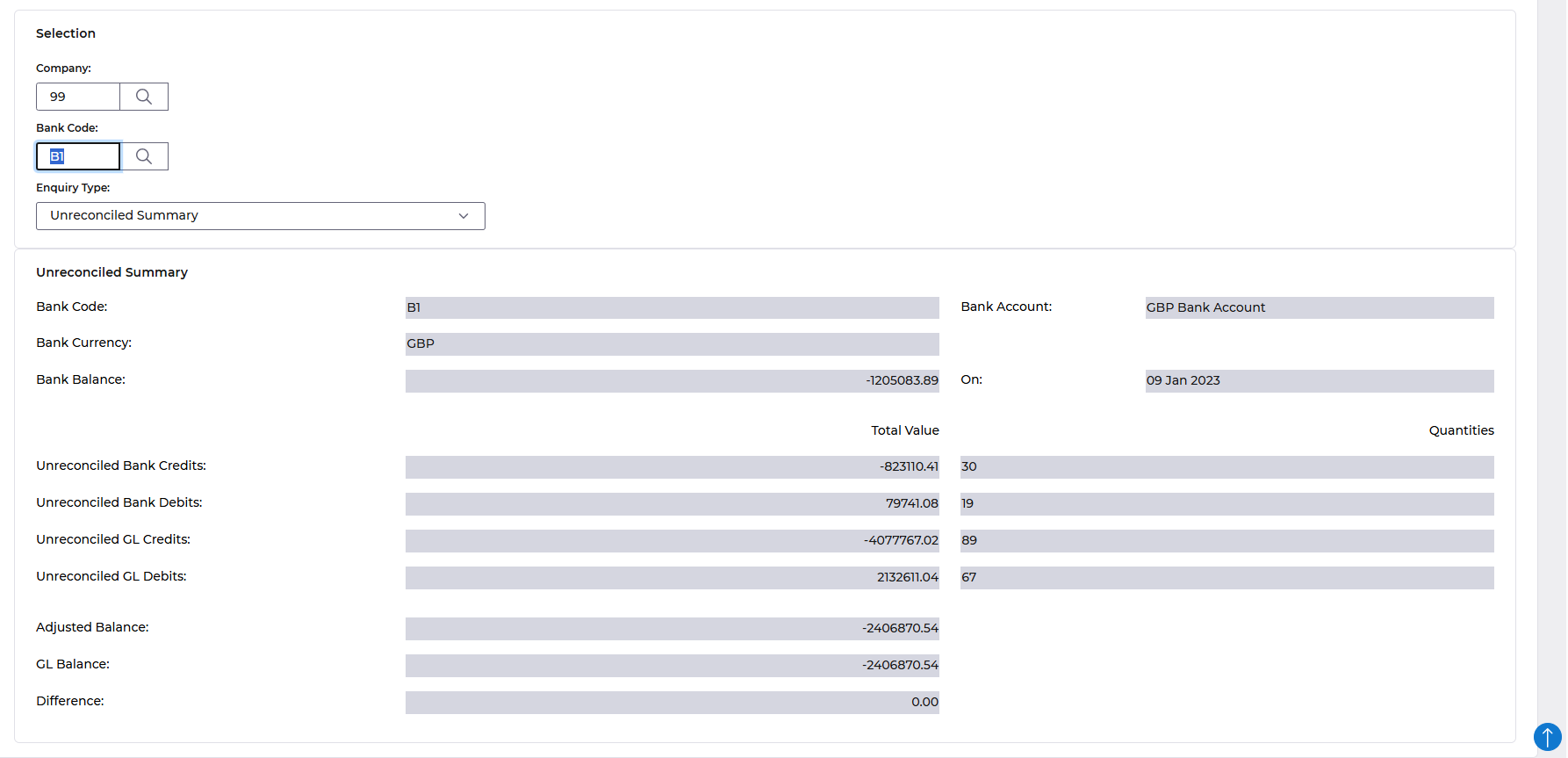 With the Enquiry Type set to Unreconciled Summary or Adjustment Summary you will see the view displayed below.