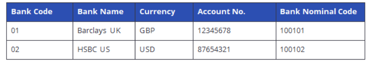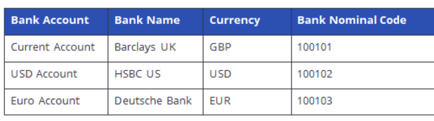 Each bank account an organisation holds (e.g. a current account, savings account, or foreign currency account) needs to be mapped to its own nominal code. This enables accurate tracking of cash movements and proper financial reporting.