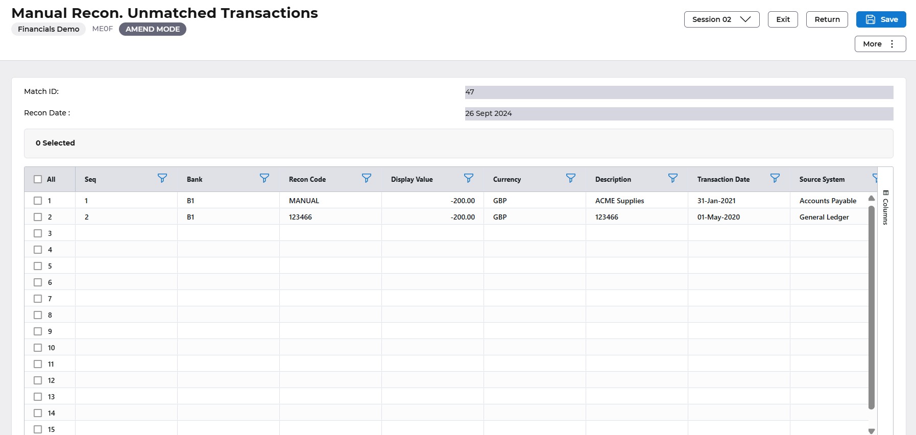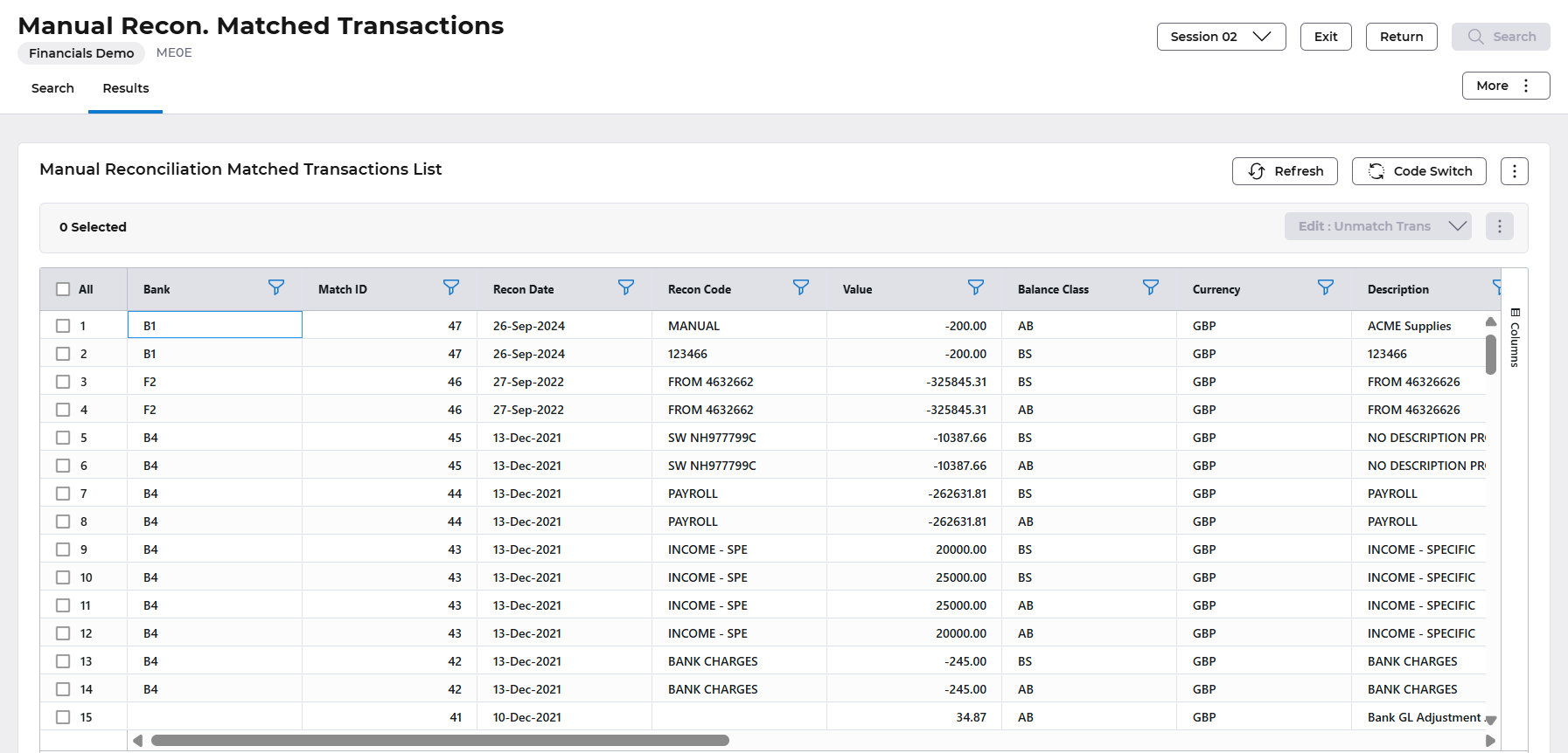The user can then select a relevant transaction and select Edit: Unmatch Trans, which will take the user to the Manual Reconciliation Unmatched Transactions screen. All transactions with the same match id will be listed on this screen.