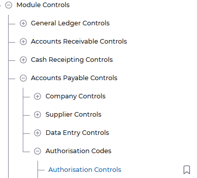 To access the Authorisation Controls screen: Systems Admin – Module Controls - Accounts Payable Controls – Authorisation Codes – Authorisation Controls.