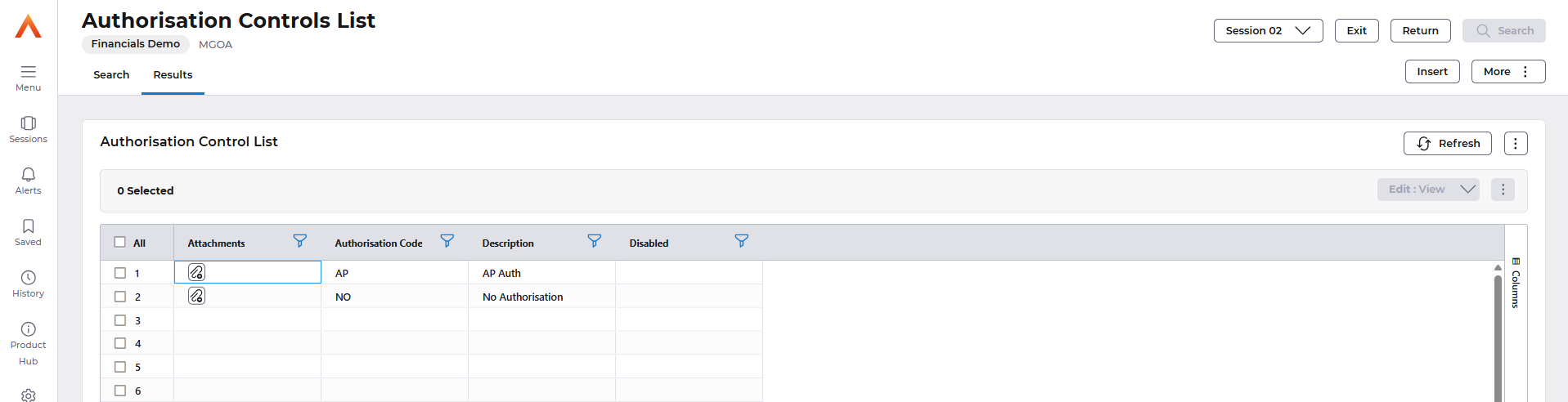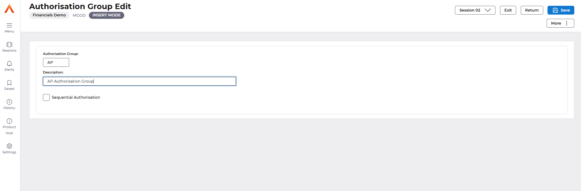 Select Search and a pre-defined Authorisation Group should be setup. If not, select Insert to create a new Group for AP Authorisation.