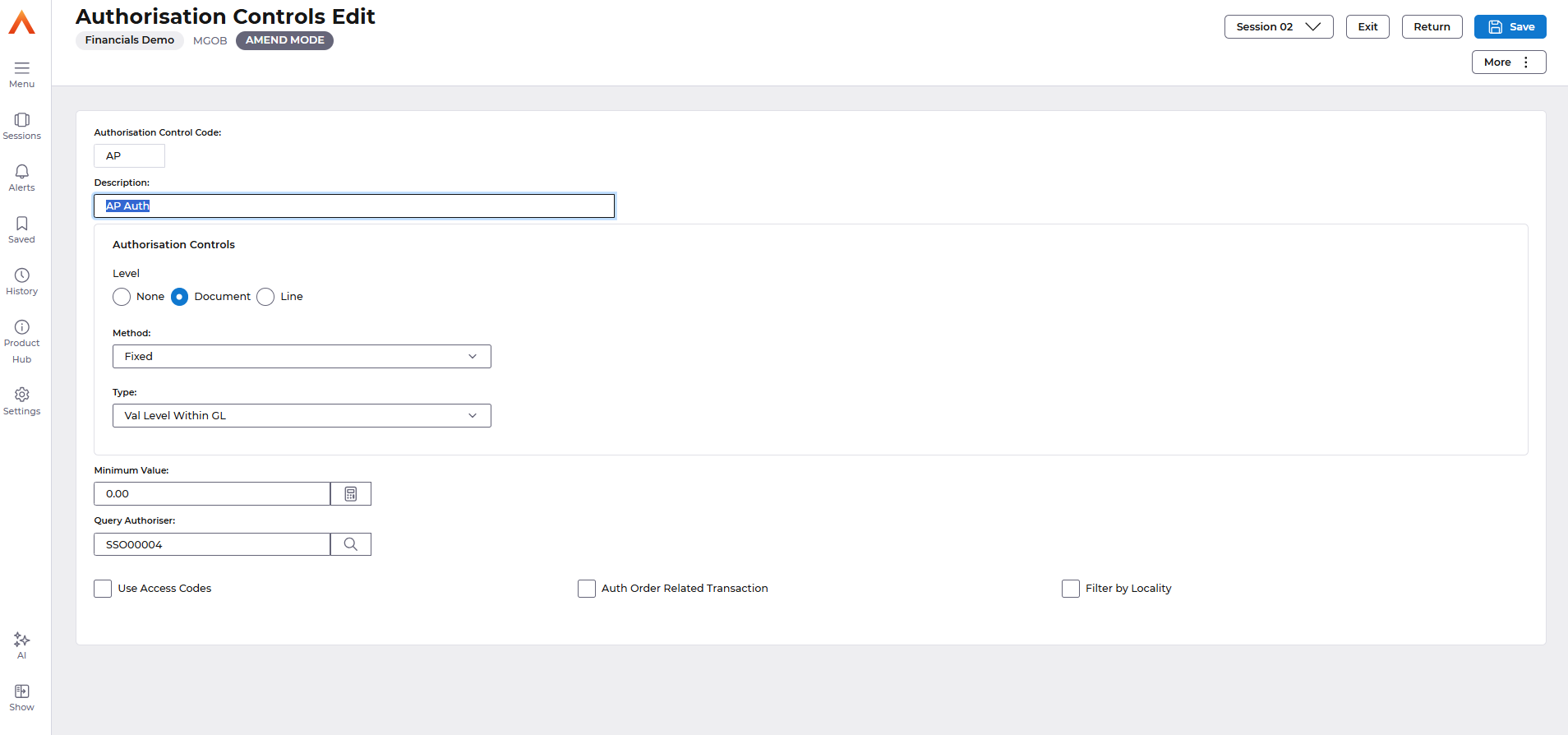 The main control code which affects the way in which authorisation is to operate is the Authorisation Control Code. This code defines the 'Method', 'Type', and 'Level' of authorisation in use. Attached to AP Company Controls (company-wide authorisation) and, optionally, any supplier (supplier specific authorisation) and any transaction legend (transaction specific authorisation).