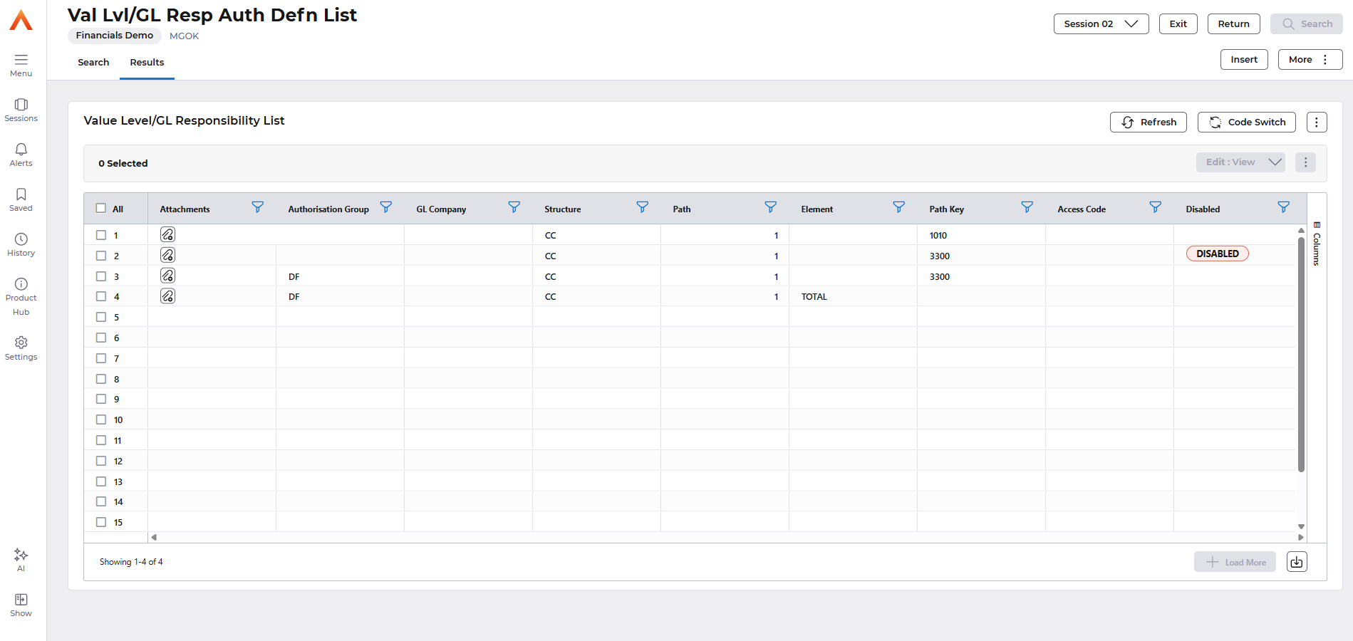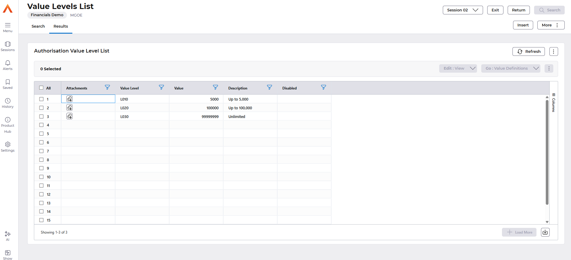 Select Search and a pre-defined Value Level list will be displayed. If you require further Value Levels, then you can Insert them from this page.