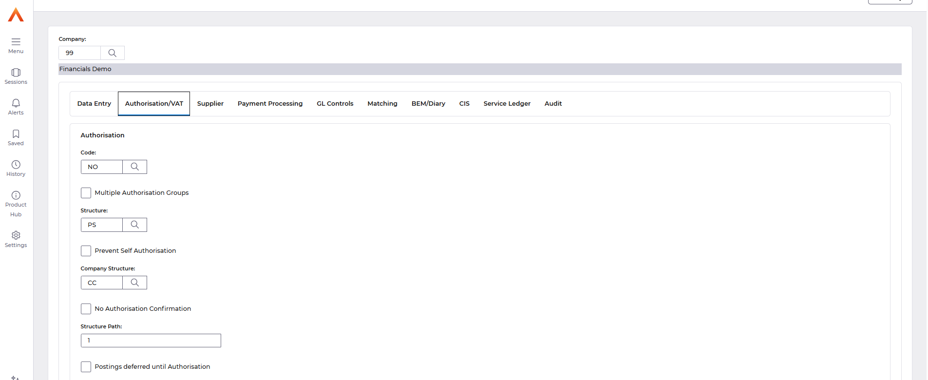 To access the Authorisation Structure screen: Systems Admin – Module Controls - Accounts Payable Controls – Authorisation Codes Authorisation Structure.