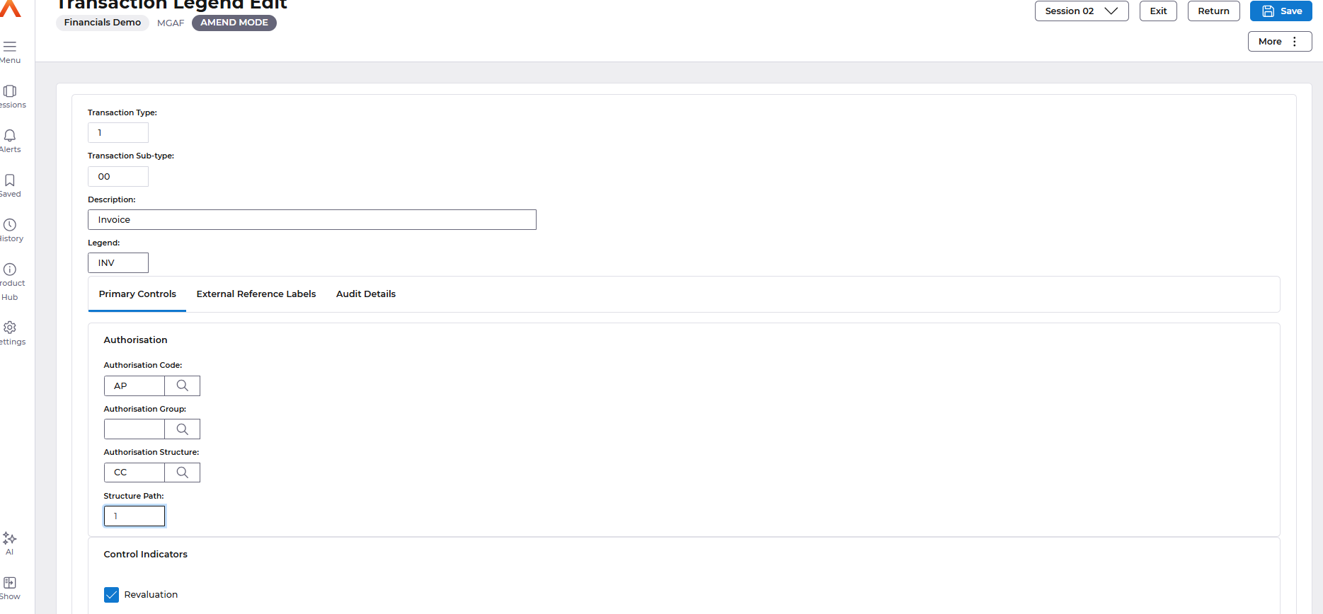 Group Codes may be defined to create different subsets of authorisers for the same type of authorisation (e.g. by value level within GL). These may then be attached at Transaction Legend level. The group may be attached to the transaction legend if an Authorisation Code is nominated, so for example, a invoice brought onto the system via an interface could have a different set of authorisers from an invoice input on-line.