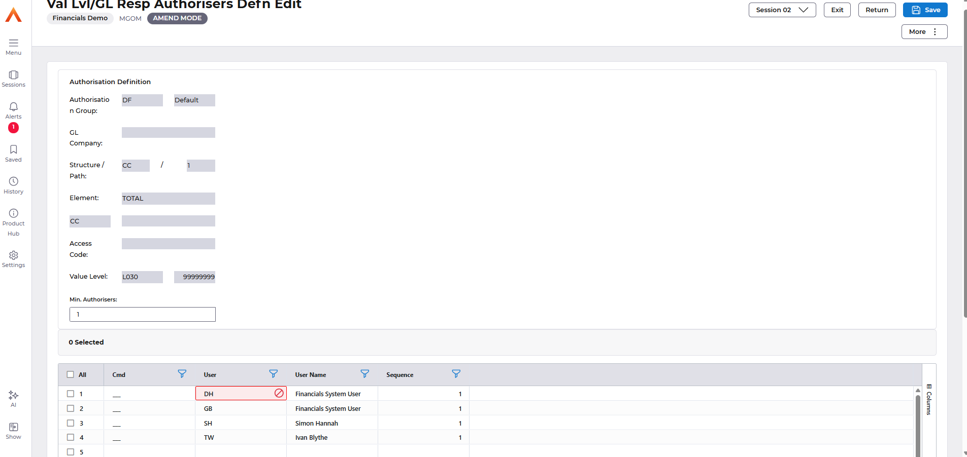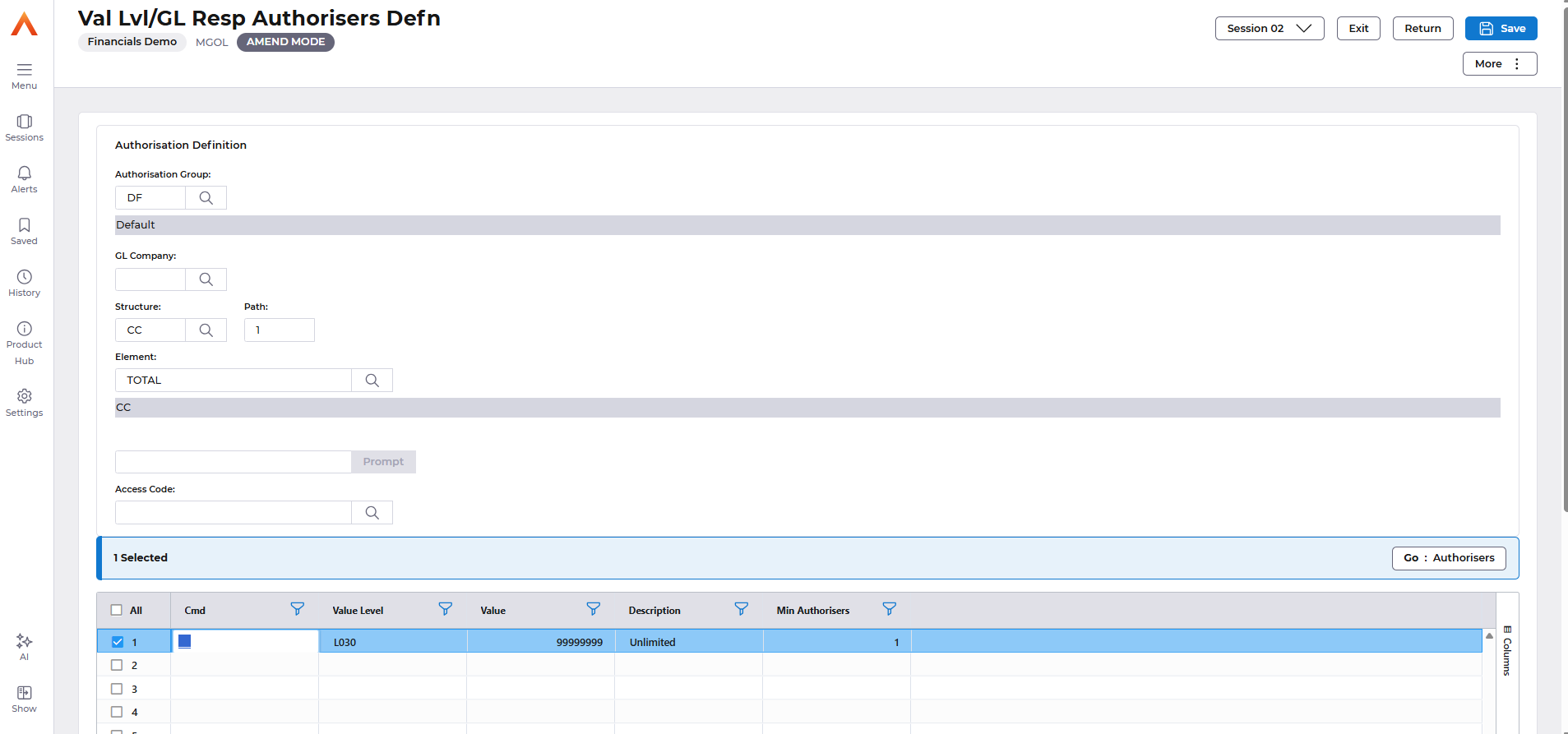 You have built all elements and now need to build the Authorisation Structures so documents that get created get routed to the correct person for Authorisation. Every entry on this page represents a GL code so potentially this list could be large, depending on how many codes you have and who those should be routed to if used on an Invoice and/or Credit Note.